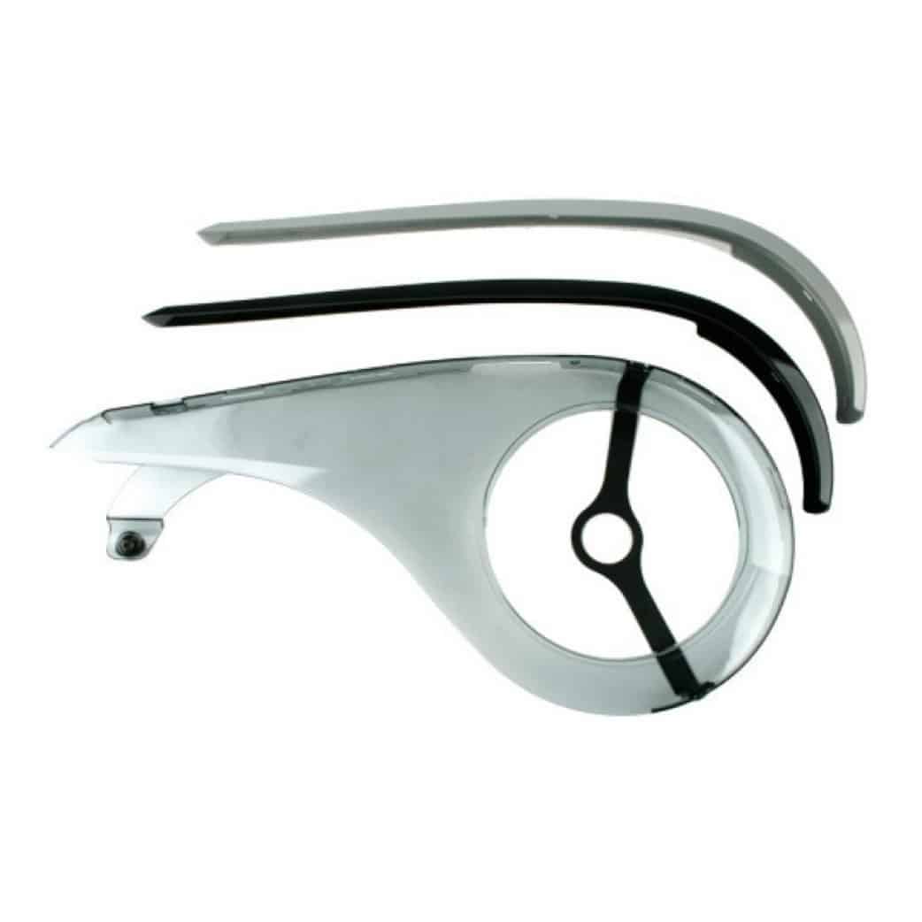 Axa kettingscherm Scope 2 44t is een modern vormgegeven kettingscherm met eenvoudige montage. Beschermt uw kleding tegen beschadigingen, en beschermt uw ketting tegen weersinvloeden als vocht en vuil. Het elegante ontwerp wordt gecompleteerd door de gekleurde strip die de montagegaten afdekt. U kunt ter plekke beslissen welke kleur strip u gebruikt, omdat zowel de zilveren als de zwarte strip met het scherm meegeleverd worden. De strips zijn gemaakt van ABS en het scherm van polycarbonaat (light smoke). De Scope2 is geschikt voor montage op single en triple tandwielen met 44 tanden.