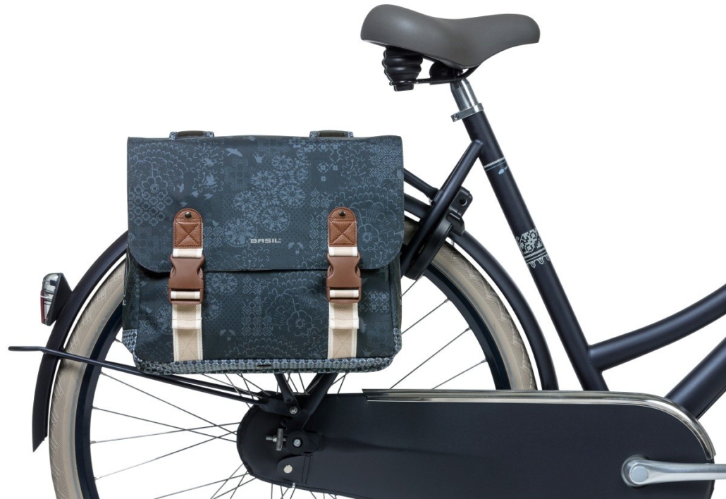 Basil Bohème Dubbele Fietstas Indigo Blue De charmante Basil Bohème dubbele fietstas heeft een uniek design met fraaie details, is van waterafstotend polyester en heeft een inhoud van 35 liter. Voorzien van binnenvoering en reflectie en verkrijgbaar in vier kleuren.
