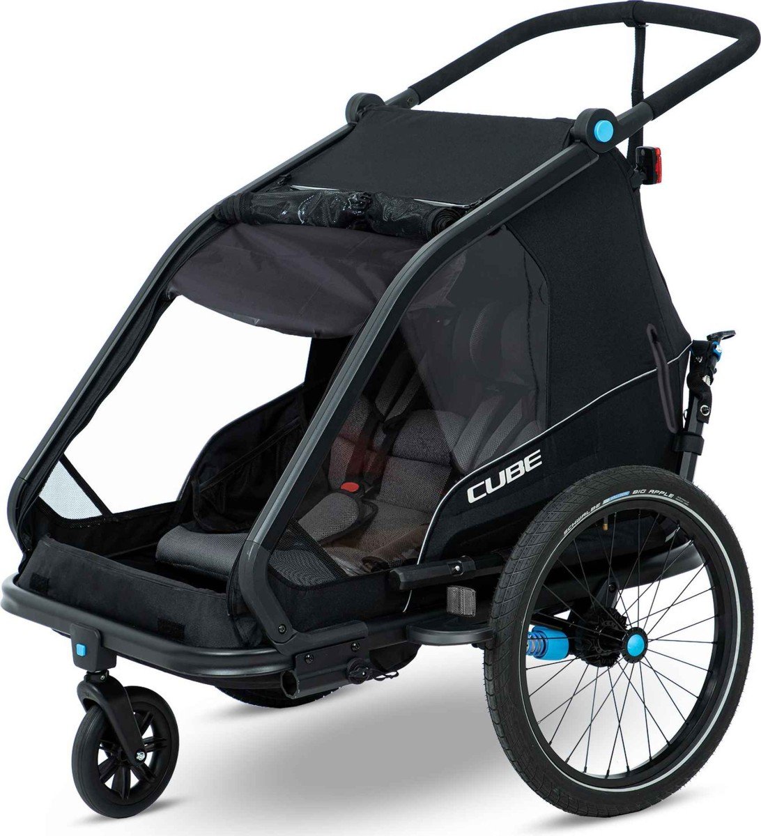 De CUBE Double CMPT-trailer is als een vriend die altijd voor je klaarstaat. Dit handige multitalent is een fietsaanhanger en een kinderbuggy in een.