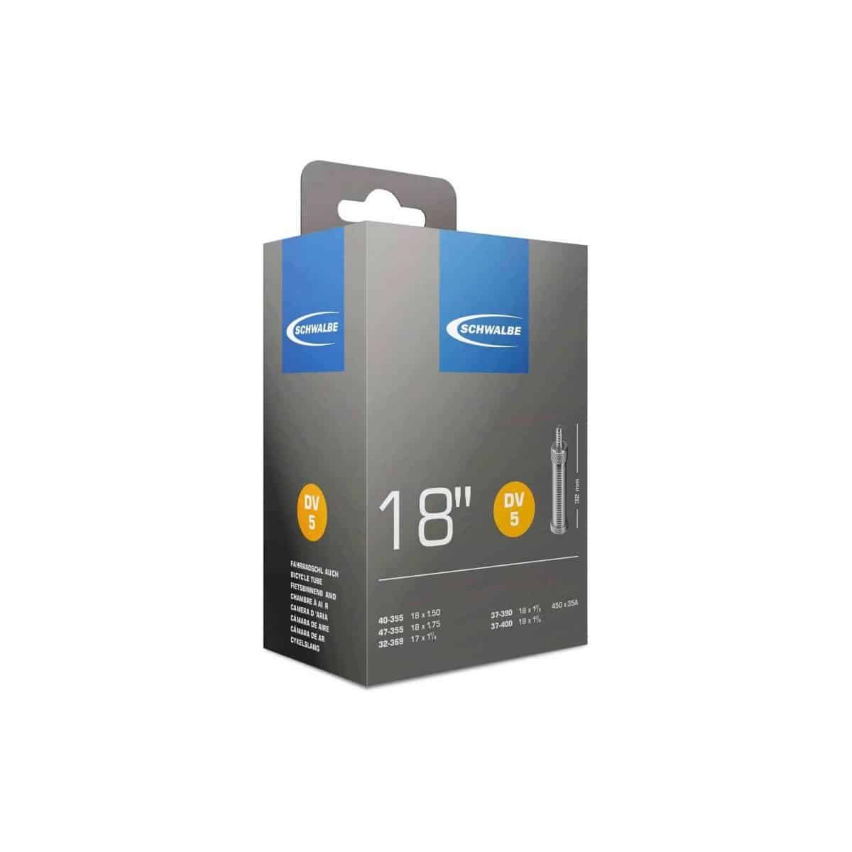 Schwalbe binnenband Standaard 18 Inch Hollands – DV5/40-355, 47-355, 32-369, 37-390, 37-400. De Schwalbe binnenbanden zijn betrouwbaar. Fietsdetaillisten waarderen hem om zijn hoge betrouwbaarheid. Iedere band wordt in de fabriek opgepompt en zo 24 uur op luchtdichtheid getest. De band houdt de luchtdruk langer vast. In de productie vereist Schwalbe een zeer hoog butyl aandeel en een zeer hoge reinheid van het materiaal. Zo houdt de Schwalbe binnenband de luchtdruk beduidend langer vast dan andere binnenbanden. Het is een groepen-binnenbandsysteem: Een Schwalbe binnenband is extreem elastisch en past op meerdere bandafmetingen. Hierdoor worden ze groepen binnenbanden genoemd. Zo past bijvoorbeeld de binnenband met nummer 19A voor bandafmeting van 27.5 inch tot 29 Inch en voor de breedte van 40 tot 62mm. Als laatste is de band 100% volledig recyclebaar. Standaarduitvoering: Hoge betrouwbaarheid, al vele jaren beproefd.