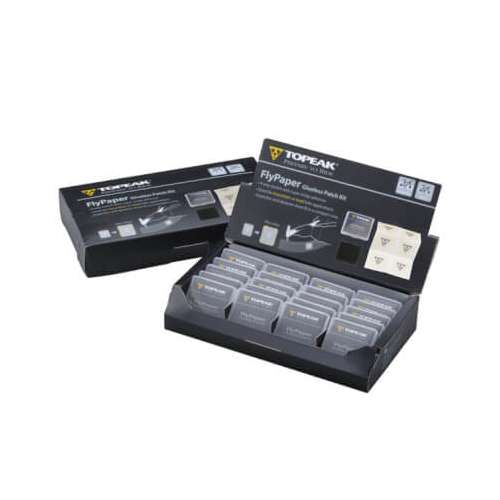 Topeak Flypaper Glueless, display met 20 doosjes bandenplakkers , inhoud los doosje :6 plakkers/ pleisters , binnenbanden plakken zonder lijm.TGP03